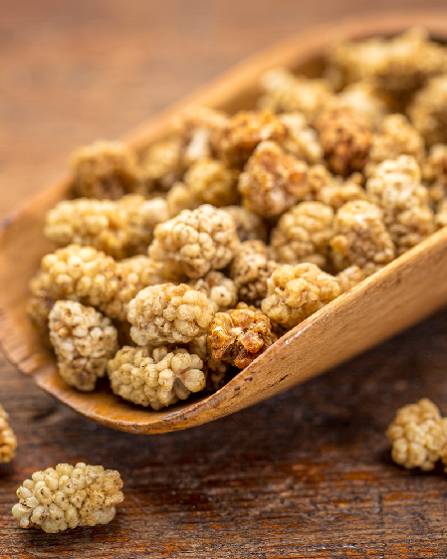 Dry white mulberries are known for their naturally sweet taste, chewy texture, and excellent nutritional value. Rich in antioxidants, dietary fiber, vitamins, and essential minerals, they make a healthy snack and are widely used in breakfast bowls, desserts, bakery items, herbal mixes, and traditional recipes. Their mild sweetness makes them a natural alternative to refined sugar.