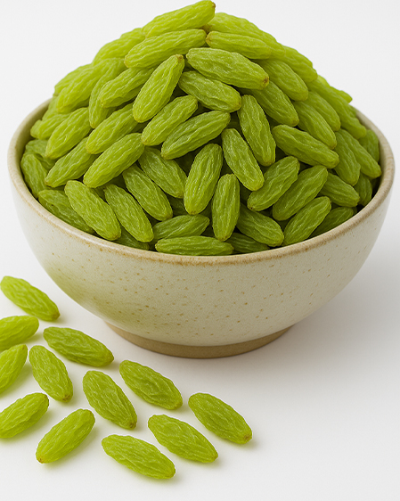 Green Raisins Kashmiri are valued for their rich nutritional benefits and pleasant taste. Naturally rich in dietary fiber, antioxidants, vitamins, and essential minerals, they support digestion, energy, and overall well-being. With a mildly sweet flavor and tender chew, they are ideal for snacking, desserts, baking, cereals, confectionery, and traditional recipes. Their attractive green color enhances both taste and presentation.